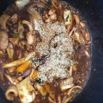 - 오징어가 어느 정도 익으면 준비한 양념을 넣고 골고루 섞어줍니다.